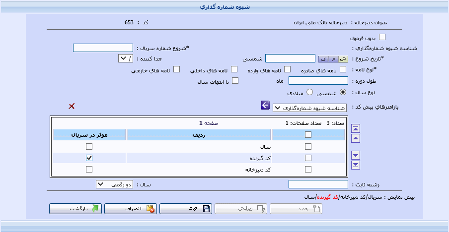 کنید يك سازمان كه سيستم را ميان سال مستقر كرده، همان موقع را تاريخ شروع قرار داده و طول دوره را 12 ماه گرفته باشد. اگر در يك شيوه شماره گذاري سال به عنوان پارامتر پيش كد انتخاب و در سريال مؤثر شده باشد، شماره سريال اولين نامهاي كه در آغاز سال ثبت شود عددي است كه در شروع شماره سريال تعيين شده است. شماره سريال نامهها در ابتداي دوره بعدي نيز از عددي كه در شروع شماره سريال تعيين شده است شروع ميشود و ممكن است در يك سال شماره ثبت نامهها تكراري باشد.