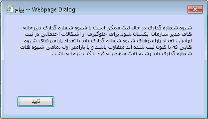 - اگر هیچ کدام از پارامترهای پيشكد شناسه شیوه شماره گذاری، كد دبيرخانه و یا رشته ثابت غیر تکراری انتخاب نشده باشد، سيستم اين شيوه را با شيوههاي تاكنون ثبت شده در دبیرخانههای دیگر که همان تعداد پارامتر پیشکد داشته مقایسه کرده و پنجره يك پيام هشدار مانند شكل زير باز ميشود.