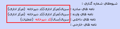 عنوان پارامترهايي است كه ميخواهيد به عنوان پيشكد در شماره ثبت نامهها ديده شود. هر تعداد از پيشكدها مانند سال، كد نوع نامه، ... را كه لازم ميدانيد يكبهيك از فهرست كشويي انتخاب و روي نشان كليك كنيد تا در جدول زير آن پديدار شود. در اين صورت شماره ثيت نامه، از يك شماره سريال و مقدار پارامترهاي پيشكد انتخاب شده درست ميشود كه ميانشان نماد جدا كننده گذارده شده است.